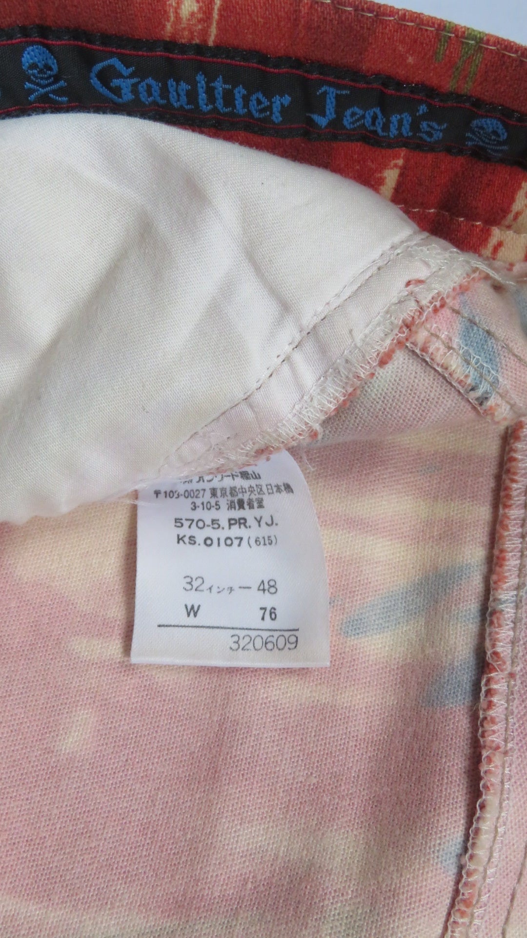 A very raw and interesting look that was introduced by Jean Paul Gaultier with these pants. Featuring bloodsplatters dripping from the waist and multicoloring throughout the pants. Marks of general wear is visible in form from little stains.