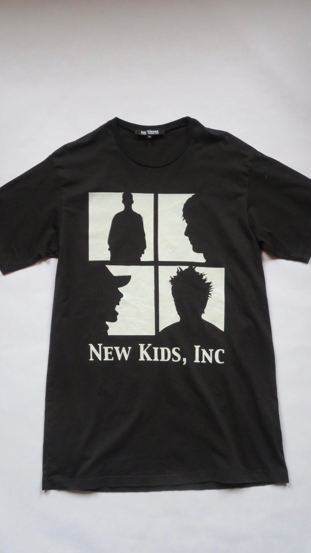 Raf Simons Spring/Summer 2003 “New Kids Inc.” T‑shirt from the legendary “Consumed” collection. This archival tee features a striking front graphic with silhouetted figures and bold text, echoing the look of early‑80s band merchandise and post‑punk/new wave visuals. True to SS03, it explores themes of youth culture, branding and consumerism, making it a highly sought‑after piece for Raf Simons collectors and archive enthusiasts. High quality blank and in flawless condition.